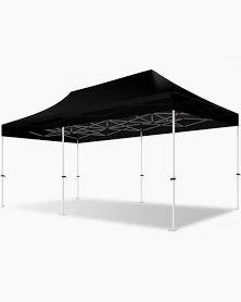 L’essentiel pour fêter : tonnelle noire, tables, baffles.